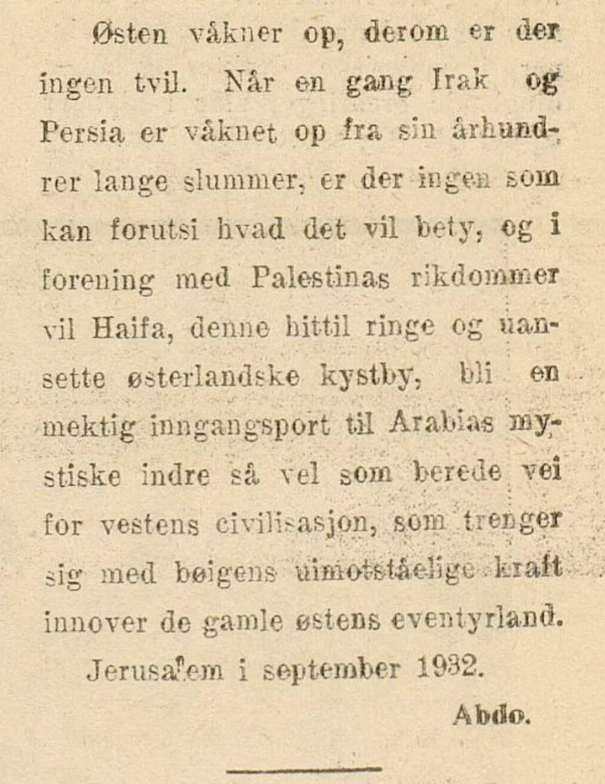 Avisa Morgenposten hadde ein korrespondent, med kone, på plass i Haifa i november 1932. Korrespondenten skisserte opp fleire framtidsplanar for kva dei omfattande hamneplanane i Haifa kunne føre med seg. «Abdo», som han er oppført som i avisa, noterte seg spesielt fleire norske skip.